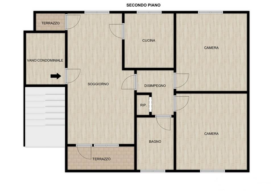 La zona notte è composta da due camere matrimoniali, un bagno finestrato con doccia ed un ripostiglio.